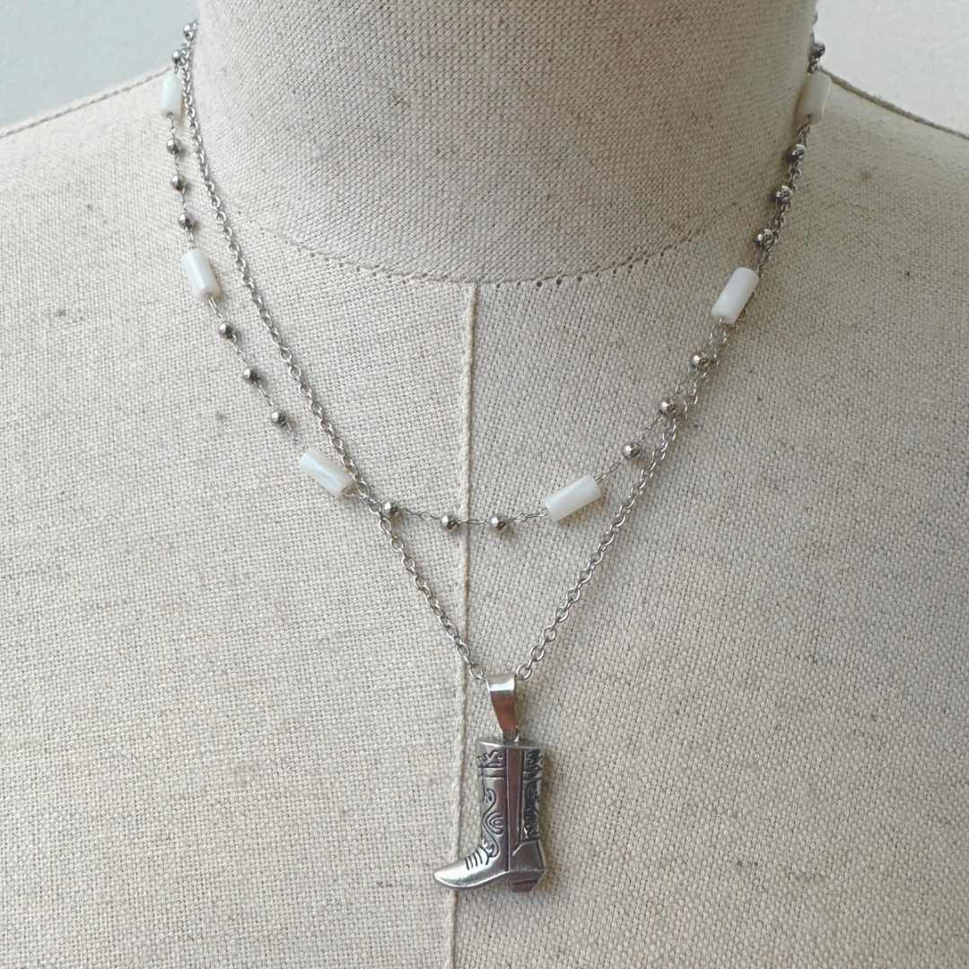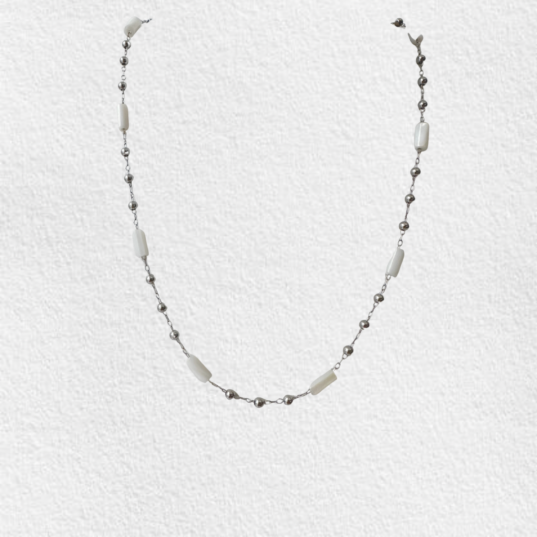 Colar em aço inoxidável com bolinhas prateadas e missanga tubo madrepérola.